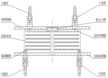 Ⅱ型——支座与墩、梁之间采用套筒连接,支座底面不设预埋钢板,底钢板和套筒之间采用锚固螺栓连 接,上预埋板与顶钢板之间采用卡榫连接,上预埋钢板与套筒之间采用配合焊接。 HDR(Ⅱ)高阻尼隔震橡胶支座结构示意图(固定型)